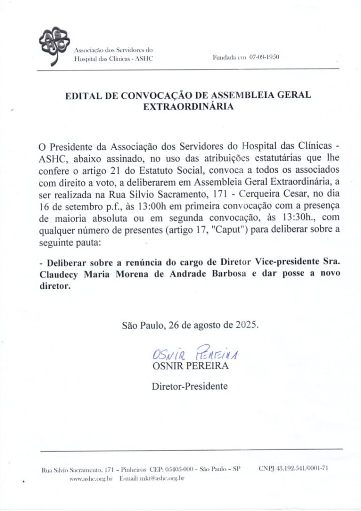 Em atendimento ao Estatuto Social vigente, a secretaria da ASHC publica a convocação para a assembléia Geral Extraordinária.